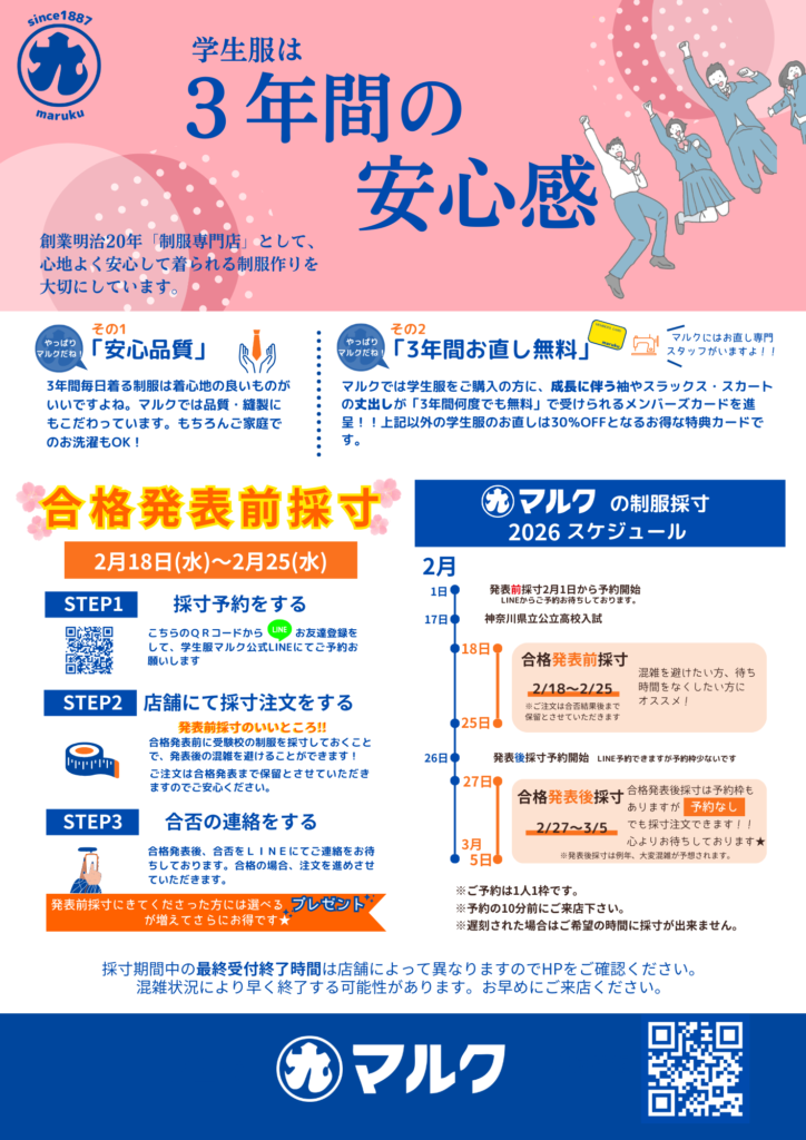 ➡合格発表前に予約にて採寸していただくことで、お待たせせずに採寸注文させていただきます。そして合格発表後にLINEにて合否を教えていただければOKです!!詳しくは上記チラシ画像をご覧下さい!!